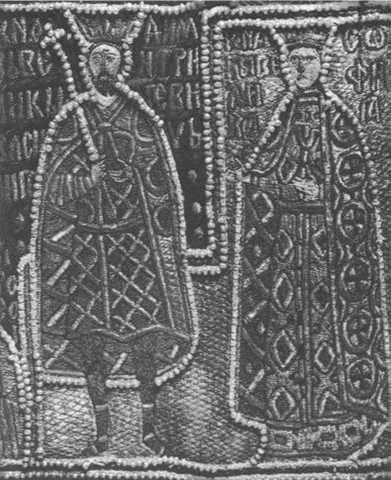 Великий князь Василий Дмитриевич и его супруга Софья Витовтовна. Изображение с шитого покрова. XV в.