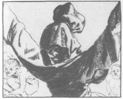 Теме критики религиозного изуверства посвящена серия рисунков Гойи под общим названием „Узники инквизиции". В этих рисунках, где изображены жертвы инквизиции в колпаках позора, надетых на них инквизиторами, со связанными сзади руками, заключенные в темницах, пытаемые, отчетливо выражена ненависть к инквизиции, калечащей тела и души людей, сострадание и жалость к „еретикам". Борьба с „чудовищами" невежества, фанатизма и мракобесия велась испанским художником в течение всей жизни. Она нашла свое отражение и в фресках из так называемого,Дома Глухого", созданных им в последние годы жизни, и во многих других его работах.