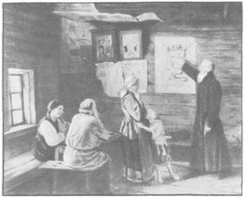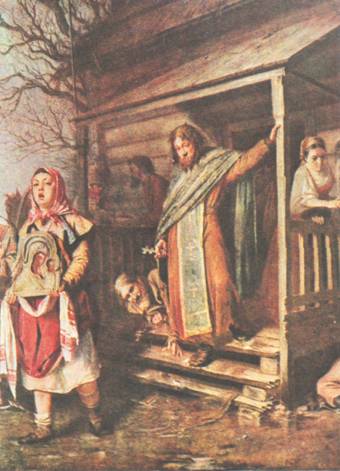 Картина В. Г. Перова „Проповедь в селе" наглядно показывает социальную роль религии и церкви в старой России. Стасов так излагает содержание этой картины: „Сельский батюшка усердно проповедует с амвона на тему „Всякая власть от бога", между тем, сидящий на самом переди, в кресле, старичок-помещик, дурачок и тряпица, сладко заснул, жена его любезничает с провинциальным франтом, а крепостной деревенский лакей кулаками пихает прочь добрых „мужичков", которым такая охота была бы послушать речей батюшкиных о власти от бога" [2].