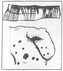 Древнейшие следы изобразительной деятельности: кость с орнаментальными нарезками и плита с ямками. Ля Ферраси