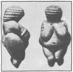 С этой же точки зрения следует оценивать особенности самых древних изображений человека. В большинстве своем это небольшие скульптурные изображения женщин (так называемые „палеолитические Венеры"). Подобным фигуркам присуща одна важная черта – стремление выпятить, наиболее ярко передать признаки пола: груди, выпуклый живот и мощный таз. Характерно, что лицо совершенно при этом не интересовало первобытного художника. По выражению А. П. Окладникова, „статуэтки оставались безликими" [1]. Если мы вспомним, что эти статуэтки возникали в верхнем палеолите, когда формировался материнский род, то вполне обоснованным представляется мнение А. П. Окладникова, что „женские статуэтки эпохи палеолита имели связь с древним культом плодородия, были культовыми предметами, талисманами и святыней жителей палеолитических поселений"[2].