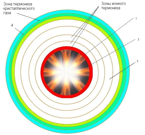 Рис. 23. Ядро Земли. Термониз. 1 – уран 238 и ионизированные продукты ядерных реакций; 2 – слой F (уран 235, 233); 3 —слои наружного ядра Земли; 4 – термониз перехода в кристаллический газ (граница между ядром Земли и мантией)