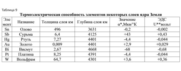 До настоящего времени нет однозначного ответа на природу образования магнитных полей Солнца и планет Солнечной системы. Одна из выдвинутых ранее гипотез предполагает генерацию магнитного поля Земли за счет индукции от суточного движения ее слоев, имеющих разные заряды. Гипотеза основана на гироскопическом эффекте Эйнштейна—Барнетта [Яновский, 1978]. Однако не был решен вопрос, какие слои и по какой причине имеют разные заряды. Предлагаемая концепция дает ответ на этот вопрос. При высоком давлении и температуре, превышающей критические значения, смеси газов расслаиваются с образованием поверхностей раздела [Кричевский, Большаков, 1941]. Ядро Земли сепарировано по слоям элементов (рис. 13), поскольку там высокое давление и высокая температура [Тимофеев, 2009б]. Слои разных раскаленных газообразных элементов ядра Земли на границах раздела заряжаются разными зарядами из-за разной величины сродства к электрону. Не исключено также, что отдельные слои ядра приобретают заряды из-за радиоактивного распада веществ слоев нестабильных изотопов. Возможно, что и слои разных пород геосфер мантии Земли имеют разные заряды. Существует ряд закономерностей возникновения электрического потенциала при контакте веществ. Это и термическая ЭДС, проявляющаяся в эффекте Зеебека, его проявление в полупроводниковых материалах, отраженное в работах А.Ф Иоффе (СССР), эффект термоэлектронной эмиссии, а при высоких температурах – ионизация элементов. Величины удельных температурных ЭДС для некоторых элементов ядра, а также приближенная оценка потенциалов слоев элементов (таблица 9).