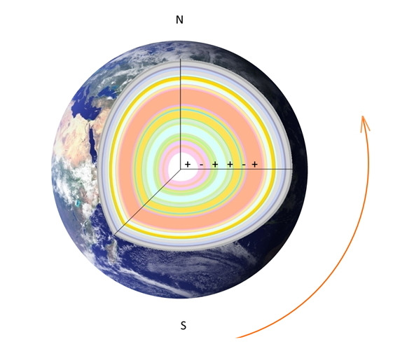 Суточное вращение Земли, следовательно, и заряженных слоев ядра, вызывает кольцевой ток. По закону магнитной индукции, кольцевой ток должен создавать магнитное поле.