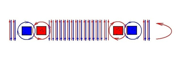Если снаружи наружного и внутри внутреннего разно заряженных, равных по величине слоев магнитные поля будут компенсировать друг друга, то в промежутке между слоями магнитные поля будут суммироваться. По этой причине, при равной напряженности полей, доминировать будет магнитное поле наружного слоя.