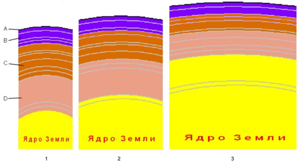 Рис. 26. Увеличение размера Земли и уменьшение толщины ее мантии со временем: 1 – настоящее состояние; 2 – состояние через один миллиард лет; 3 – состояние через 2 миллиарда лет