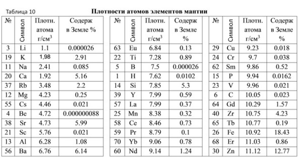 В мантии Земли плотность пород увеличивается с увеличением глубины. Это определено геофизическими исследованиями по скоростям распространения сейсмических волн. Очевидно, что породы с нарастанием глубины состоят из атомов, обладающих более высокой плотностью, хотя зависимость эта имеет отклонения за счет разных полиморфных форм, а также разных химических соединений. Плотности атомов основных пород мантии Земли, по мере возрастания показана таблице 10. В таблице также показано содержание элементов в массовых процентах [Тимофеев, 2013б]. В мантии находятся преимущественно 47 элементов от лития до цинка, что рассчитано из известных масс ядра Земли и мантии и содержания элементов в Земле. Элементы находятся, как правило, в виде химических соединений, и расположены приблизительно в порядке увеличения атомных масс [Тимофеев, 2013г].