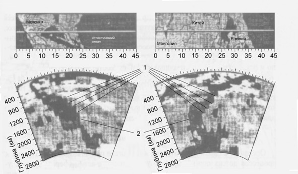 Рис. 28. Томограммы мантии Земли: 1 – границы геосфер мантии Земли; 2 – мощная геосфера соединений железа