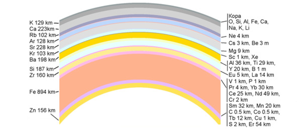 За время существования Земли происходила сепарация более тяжелых пород, что в некоторых случаях происходит даже в твердом состоянии как, например, всплытие масс соли диапиров. По массовому содержанию в мантии преобладают 11 элементов (К, Ca, Rb, Ar, Sr, Kr, Ba, Si, Zr, Fe, Zn). Из минералов на основе этих элементов в мантии Земли, вероятно, имеются 11 геосфер. Инертные газы Ar, Kr, не образующие минералов в условиях коры Земли, в условиях мантии создают твердые соединения [Тимофеев, 2013б.], что позволяет предполагать наличие целых геосфер, где породообразующим элементом они являются. Возможно, существуют сборные геосферы из элементов с близкими плотностями атомов V, P, Pr, Yb, Ce, Nd, Cr, на 10 уровне и Sm, Mn, C, Co, Gd, Tb, Cu, S, Er на 12 уровне. В сумме можно приближенно считать, что мантия имеет 13 главных геосфер толщиной более 100 км (рис. 29). Элементы в геосферах, как правило, находятся в виде ковалентных и ионных химических соединений с неметаллами Si, C, Cl, H, N, O, F, S, Br, J. Элементы, имеющие малое содержание в мантии Земли, или входят в состав минералов породообразующих элементов, или образуют тонкие пласты своих минералов на горизонтах соответствующих их плотностям.