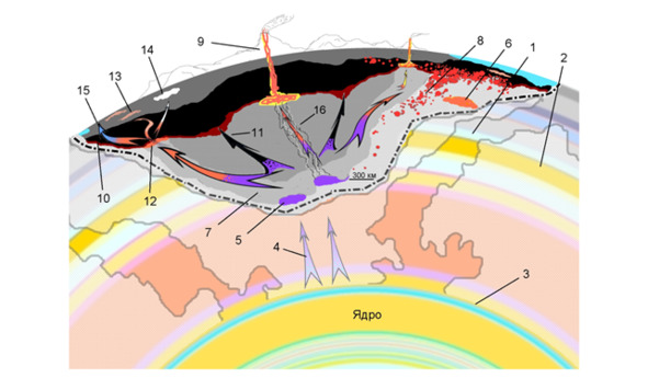 1 – массивы всплывающего очищенного дистиллированного (деплетированного) вещества ядра Земли; 2 – коренные породы мантии; 3 – зона распада вещества мантии; 4 – поднятие газов из зоны распада; 5 – скопление силановой нефти (астеносфера); 6 – скопление силановой нефти под океанами; 7 – корень континента; 8 – проекции фокусов землетрясений 1965 – 1968 гг в петропавловском секторе Камчатки на плоскость перпендикулярную Камчатскому желобу, по С. А. Федотову [Федотов, Токарев, 1971]; 9 – континентальный вулкан (Ньирагонго); 10 – утолщение коры Земли, зона синтеза базальта; 11 – интенсивное утолщение коры Земли в горных районах; 12 – скопление нитронефти; 13 – залежи углеводородов; 14 залежи карбонатов и рудных тел; 15 – выход воды, азота, углекислого газа; 16 – поднятие силановой нефти внутри континента в зоне разлома