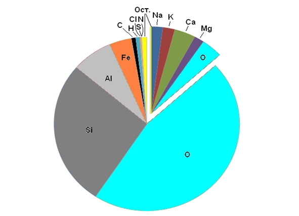 Самые лёгкие элементы Na, K, Ca, Mg очень активны и сразу после образования в результате ядерных реакций ещё в космическом облаке пыли и газов вступили в взаимодействие с кислородом и галогенами. В таком виде они попали в состав образовавшейся Земли, а затем всплыли в её верхние слои в виде соединений, например, Na2O2, K2O2, СаО, СаО2, MgO, что показано на рисунке 12б. Со временем в глубинах Земли стала образовываться и выходить на поверхность силановая нефть. Взаимодействуя с лёгкими породами, произошло образование существующей структуры поверхности. Кора Земли, океаны и атмосфера образованы в результате реакций взаимодействия поднявшейся силановой нефти с элементами легких пород верхней мантии натрием, калием, кальцием магнием. Под корой Земли ещё сохранились остатки непрореагировавшей с силановой нефтью лёгкой породы, которая может быть там обнаружена. Так в результате извержения вулкана Ньирагонго в Африке на поверхность поднимается лава из расплавленной окиси кальция. Состав коры Земли, где отдельно выделены лёгкие элементы и отдельно элементы состава силановой нефти показан на (рис. 25).