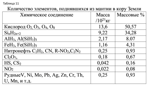 Выделенный участок диаграммы – это элементы, изначально поднявшиеся к поверхности в архее в результате первичной сепарации (рис. 12б), окиси, перекиси и соли Na, K, Ca, Mg. Основная, большая часть диаграммы – элементы силановой нефти, которая начала подниматься позже, примерно 600 миллионов лет назад, и ее поднятие продолжается в настоящее время. Половина состава силановой нефти приходится на кислород. В состав силановой нефти в количестве около 1% входит нитронефть, из которой при поднятии образуются углеводороды [Тимофеев, 2011в]. Силановая нефть в мантии находится в виде раскаленных газов под большим давлением, а в жидкое состояние ряд компонентов могут перейти только при охлаждении до нормальной температуры. Количество элементов силановой нефти, поднявшихся из мантии в кору Земли, за всю ее историю в килограммах и массовых процентах (таблица 11). (некоторые элементы показаны в виде соединений).