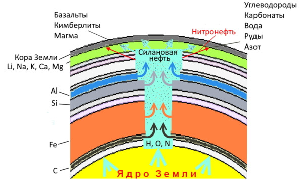 Изгнанные в результате перестановки из ядра Земли элементы: кислород, водород, азот, хлор, сера, фтор, поднимаются к коре, экстрагируя из мантии ряд других элементов. Легче всего в подвижную фазу переходят кремний, алюминий, железо, углерод, создавая жидкие соединения, например, силан SiH4 (газ Ткип. – 112°С), дисилан Si2H6 (газ Т кип. -15°С), пентакарбонил железа Fe (CO) 5 (жидкость плотностью 1.46 г/см3 Тпл. -20°С), триметил алюминия Al (CH3) 3 (жидкость плотностью 0.752 г/см3, Тпл. 15°С). Ряд элементов Мo, Zn, Cr, Pb, Th, U, Ag, Au, Pt, Os, Re… растворяются в подвижной фазе хуже, и концентрация их в коре меньше. Совокупность этих соединений, названая силановой нефтью [Тимофеев,2015а], собирается в верхней мантии и наблюдается как линзы астеносферы.