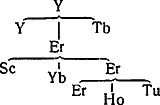 Впоследствии на химическую индивидуальность церия и лантана покушались многие исследователи. Они хотели доказать сложность этих элементов. Однако К. Мосандер действительно получил оксиды этих элементов в относительно чистом состоянии. Другое дело дидим. В современной периодической системе вы не увидите этого символа. За ним скрывается целая история, о которой речь пойдет дальше. Здесь же заметим, что дата «1839 год» представляется более правомерной в плане действительного начала биографии церия. То же самое замечание можно сделать и в отношении иттрия. За него К. Мосандер взялся в 1843 г., вдохновленный успехами своих работ по расщеплению церия. И старый иттрий Гадолина открыл истинное лицо. Собственно, здесь было три лица: сам иттрий и два чрезвычайно на него похожих элемента: тербий и эрбий. Можно нарисовать такую схему: