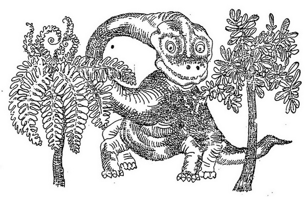 Бронтозавр-детеныш подошел к воде, по-гусиному наклонил голову и принюхался. Потом приподнял ее и тупо посмотрел на мальчишку. Старые бронтозавры стояли поодаль. Юрка уже не интересовал их. Несколько минут спустя «малыш» вернулся к ним, и семейство неторопливо направилось вдоль берега, по брюхо утопая в буйных травах.
