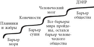 На третьем этапе существо полностью овладевает новой экологической нишей, доводя свое развитие в новой среде до совершенства или вплотную подходя к нему. Пример – дельфины, которых иногда называют людьми моря: они идеально приспособлены к жизни в морской среде, так же как и человеческие существа долгое время были идеально приспособлены для жизни на земле. Вспомним, что в свое время и динозавры были идеалом. Но все дело в том, что вечно блаженствовать в найденной экологической нише не удается ни одному существу. Рано или поздно эта экологическая ниша переполняется представителями данного вида или родственных видов. Давление в экологической нише возрастает, в ней становится тесно, и, чтобы выжить, части особей снова приходится карабкаться вверх по ступенькам эволюции, либо меняя место обитания, либо приобретая новые качества, дающие преимущества перед сородичами. Так заканчивается третий этап эволюционного барьера и начинается переход на следующую ступень эволюции.