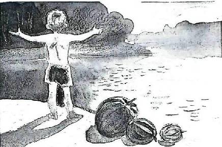Так прытко я бегу, что даже дорогу не чую босыми ногами. Ух! Вот я встаю. И – это что такое? – пойма пошла вертеться, как пластинка! Как есть вся пойма – с арбузами, с дынями, с лисами, с зайцами. А я…
