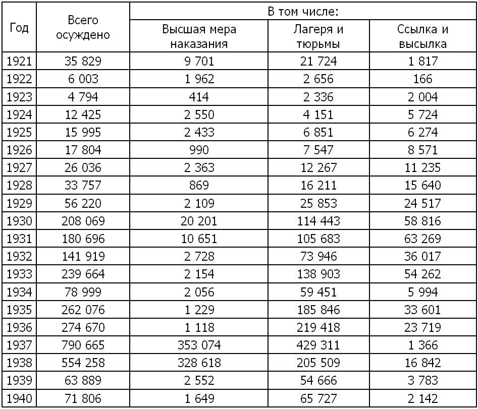 За 1930–1939 годы было осуждено 2,8 млн. человек, из них 1,35 млн. – за два года борьбы Сталина с элитой, 1937 и 1938 (другие два страшных года, 1931 и 1932, пришлись на раскулачивание). К высшей мере за десятилетие приговорено 724,4 тыс. человек, а за 1937–1938 – 684,2 тысяч. Но следует учитывать, что примерно треть от общего числа осуждённых составляли уголовники, в том числе убийцы и грабители, а совсем не политические. Также надо иметь в виду, что не все приговоры приводили в исполнение. Например, с 15 июля 1939 по 20 апреля 1940 года за дезорганизацию лагерной жизни и производства был приговорён к высшей мере наказания 201 человек, однако потом части из них смертная казнь была заменена заключением на сроки от 10 до 15 лет. И это не единственный случай.