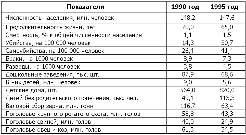 Посмотрим на результаты реформ. Мы получили спад производства вдвое, замедление развития самых передовых отраслей, снижение жизненного уровня у 85 % населения с переходом очень значительной его части за черту бедности. Был разрушен экономический, а особенно военный потенциал Советского Союза, а затем и России.