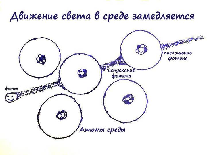 Каждый второй комментатор лекций про скорость света обязательно блеснет знаниями о том, что скорость света бывает медленной. Да, всё верно, но это происходит, когда свет распространяется в какой-то среде, например, в воде – на 25 % медленнее, чем в вакууме. В этом случае свет по цепочке поглощается атомами вещества, через которое летит, и испускается дальше – на всё это тратится некоторое время, отчего мы и видим, как все замедленно и банально.