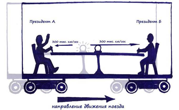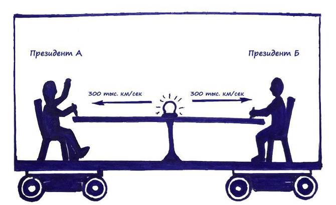 Президент страны А глядит вперед по ходу движения состава, а президент страны Б сидит спиной к направлению движения поезда. Итак, лампочка загорелась, свет со своей постоянной скоростью 300 000 км/сек полетел в разные стороны (напомню предыдущую лекцию, где мы говорили о том, что в системе отсчета президентов вагон покоится на месте, скорость света не складывается со скоростью поезда), и в итоге свет достиг глаз президентов ОДНОВРЕМЕННО – стороны подписали мирный договор.