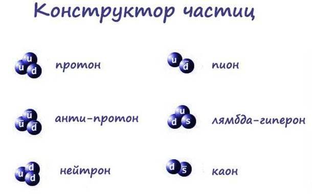 На картинке: схемы некоторых частиц, сложенных из кварков. Кварк с черточкой – это антикварк.
