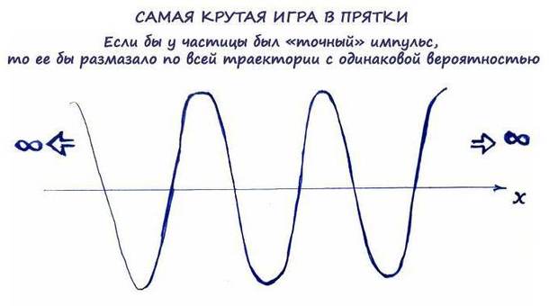 Из экспериментов следовало, что если бы мы точно знали импульс частицы, то мы бы вообще ничего не знали о ее местонахождении. Она бы с одинаковой вероятностью находилась в любом месте траектории.