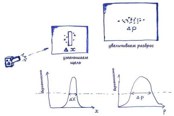 Чтобы не приводить в пример мудреные графики и формулы, вот вам демонстрация принципа неопределенности на простом опыте. Если стрелять частицами по широкой щели, то на экране позади будут появляться следы частиц примерно в окрестностях проекции щели. Но вот мы начинаем уменьшать щель, то есть загонять частицы в этот самый Δx. И что же мы видим на экране? Импульс (не забываем, что у него есть направление) становится более непредсказуемым.