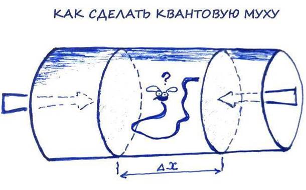 Наглядную, но не слишком правильную аналогию, демонстрирующую принцип неопределенности, мы вычитали у какого-то автора, пытающегося делать то же, что и мы. Представьте себе непрозрачную трубку, в которой летает муха. Вот она летает от одного конца трубы до другого. Ее средняя скорость нам вполне известна (справились у Википедии), но местонахождение животинки мы предсказать не беремся: муха может отклониться от траектории, присесть, помыть лапки и так далее на всей длине трубки. Но вот мы начинаем трубку сжимать. Муха видит, как на нее надвигается гигантский пресс. Места для ее полетов все меньше и меньше. Муха паникует и начинает ускоренно летать в сжимающемся пространстве, врезаясь в стенки. Теперь мы знаем ее местонахождение гораздо точнее, но вот ее скорость уже не предсказуема. Паника творит чудеса даже в микромире, не правда ли?