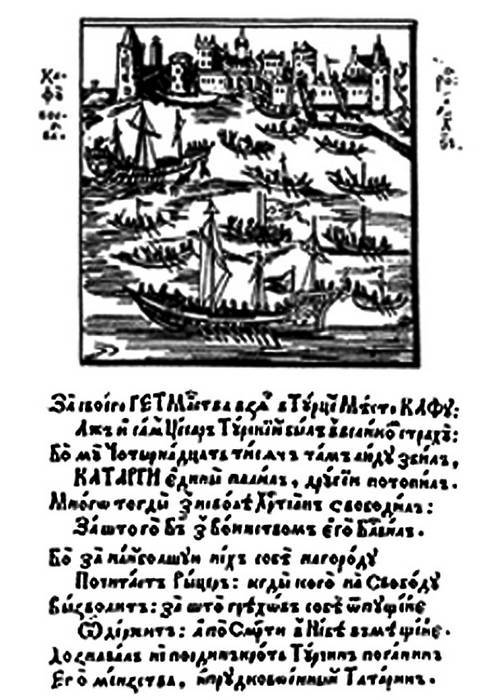 Взятие Каффы запорожцами. Гравюра из книги «Стихи на жалостный погреб благородного рыцаря Петра Конашевича-Сагайдачного». 1622 г.