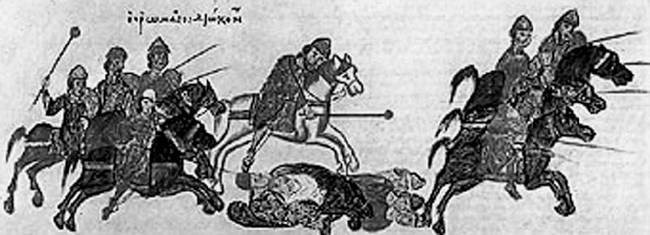 Преследование отступающего русского войска византийцами. Миниатюра из «Истории византийских императоров в Константинополе с 811 по 1057 год, написанная куропалатом Иоанном Скилицей». XII век