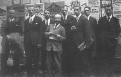 Прага, 10 июня 1926 г. «Скит поэтов» около «Русского дома» на Панской улице. Слева направо: С. М. Рафальский, С. Г. Долинский, А. А. Воеводин, А. Л. Бем, Н. В. Дзевановский (Болесцис), И. И. Тидеман, В. Г. Федоров, Б. К. Семенов