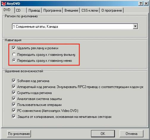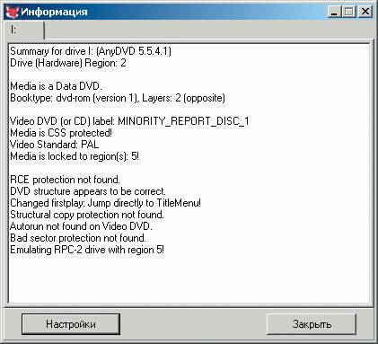 Эта фраза украшает тыльную сторону обложки фильма, который мы собрались привести в божий вид. Оно, конечно, замечательно, что правообладатели столь ревностно относятся к защите своей продукции, но, скажите на милость, стоит ли говорить об эффективности защиты, когда в Сети без труда можно найти легитимные программы, с чьей помощью обнуляется любая защита DVD? Я предпочитаю AnyDVD (1,2 Мбайта, shareware), обладающую талантом мгновенно избавлять пользователя от бессмысленных (на мой взгляд) блокировок.