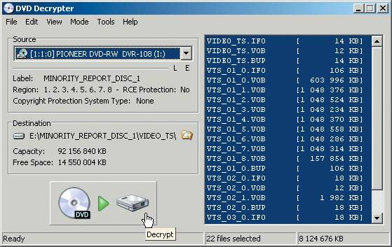 Работа с утилитой чрезвычайно проста: по умолчанию в меню Mode предлагается режим File, что нам и требуется. Остается выбрать раздел для сохранения файлов DVD и нажать кнопку Decrypt ( рис. 4 ).
