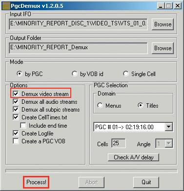 Следующий этап подразумевает разделение (демуксинг) DVD-контента на составляющие: видеопоток, звуковые дорожки и субтитры. Возможно, кто-то из читателей встречал на специализированных форумах аббревиатуру PGC – это не что иное, как ProGram Chain, то бишь некий контейнер для видео, звуковых дорожек, и команд. В PGC содержатся данные, определяющие порядок воспроизведения частей фильма (файлы вида VTS0xx.VOB) и команды навигационного меню. Как видите, ничего страшного. Бесплатная программа PgcDemux (288 Кбайт) еще проще: состоит из единственного окна и не требует инсталляции.