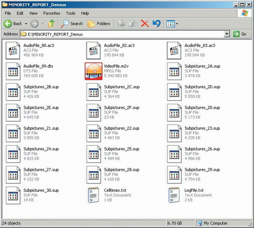 По окончании процесса разделенный DVD выглядит по принципу «мухи отдельно, котлеты отдельно»: файл VideoFile.m2v есть не что иное, как видео, звуковые дорожки превратились в файлы с расширением ac3 и dts, а многообразие большого числа субтитров на разных языках приняло вид файлов формата .sup ( рис. 7 ).