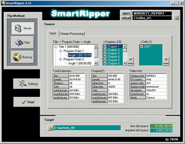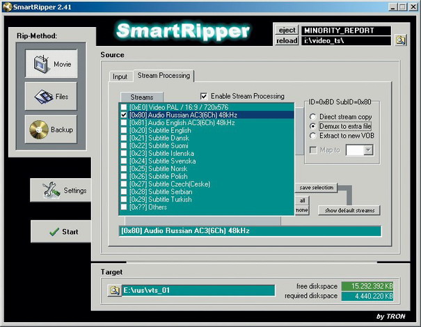 Порядок действий следующий: загрузим искомый DVD в привод и запустим файл SmartRipper.exe. Программа проведет анализ диска, после чего можно приступать к извлечению дорожки. По умолчанию софтина предлагает сразу оперировать с основным фильмом – параметр Angle 1 [02:19:15] ( рис. 8 ).