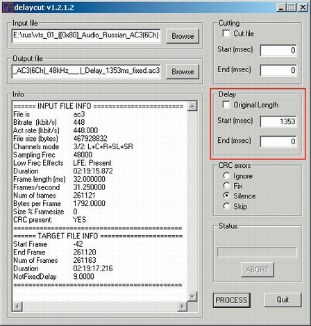 Еще одна бесплатная полезняшка , не требующая инсталляции (284 Кбайт), за пару щелчков мыши устранит рассинхронизацию изображения и звука. Достаточно указать в поле Input file «несговорчивую» звуковую дорожку, а в секции Delay · Start (msec) вписать значение задержки (если звук опережает видео, значение delay следует указывать со знаком «минус»). О названии исправленного файла можно не заботиться – программа самостоятельно сохранит обновленный трек с именем вида fixed.ac3 ( рис. 10 ).