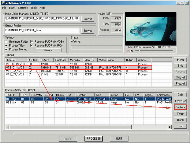 Вам наверняка интересно, зачем я на скриншоте «прочертил» вторую стрелку к кнопке Replace? Извольте: чуть выше говорилось о приведении в божий вид IFO-файлов в каталоге с DVD, созданном героически-равнодушными усилиями программы IFO Edit. Именно кнопка Replace и позволит заменить часть безликой информации, касающейся звуковых дорожек и субтитров, на корректную. Нажав кнопку Replace, мы и объясним программе, в каких IFO-файлах следует провести замену – достаточно указать файл VTS010.IFO из папки, где хранятся DVD-файлы, рожденные IFO Edit.