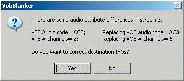 Особо внимательные читатели вправе недоуменно вскинуть брови: как же так, ведь в оригинальных IFO-файлах черным по белому сказано о двухканальной сущности русского аудиотрека, и, таким образом, эти данные перекочуют в новый проект? Смею вас уверить, что VobBlanker – паренек умный и сразу после приказа о замене вежливо осведомится о необходимости внесения изменений во вновь создаваемые IFO-файлы: дескать, Do you want to correct destination IFOs ( рис. 17 ).