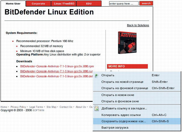 К сожалению, все антивирусные программы для Linux от именитых разработчиков нам не подходят, так как устанавливаются в системные каталоги, что, как мы выяснили, в нашем случае неприемлемо. Поэтому воспользуемся менее известным в широких кругах (но не уступающим по профессиональным качествам своим коллегам) программным продуктом от компании BitDefender , свободная версия которого отвечает нашему главному критерию: способна работать без установки в системные каталоги. Для этого нужно загрузить с официального сайта пакет с программой и сохранить его в домашнем каталоге. Из трех вариантов предлагаемых к загрузке файлов – с расширением RPM, RUN или DEB – нам подходит второй, так как остальные пакеты предназначены для стационарно установленных операционных систем. Для загрузки лучше воспользоваться контекстным меню правой кнопки мыши, выбрав пункт «Сохранить содержимое как…» ( рис. 1 ).