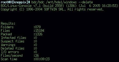 Прежде чем начать проверку файлов и папок, необходимо подключить и перевести в режим чтения-записи те разделы жесткого диска, на которых будет осуществляться проверка, – не будем забывать, что Knoppix обладает некоторыми «причудами» в плане обеспечения сохранности данных на диске, что, впрочем, весьма полезно при «охоте на вирусы». После этого опять же в root-консоли вводим команду bdc/bdc /mnt/hda1/windows -delete ( рис. 4 ),