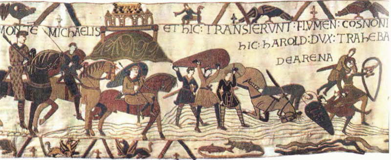 Гарольд приходит на помощь рыцарям, завязшим в песке при переправе через реку Куэнон