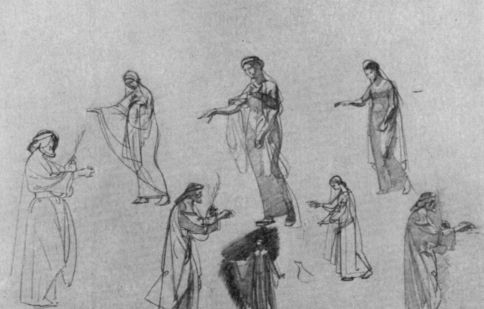Набросок нескольких фигур на одном листе. Начало 1880-х гг. Б., кар. Музей И. И. Бродского. Ленинград.
