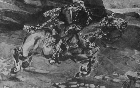 Скачущий всадник. «Несется конь быстрее лани…». Б., черн, акв., белила. Илл. к Собр. соч. М. Ю. Лермонтова. 1891 г. ГТГ.