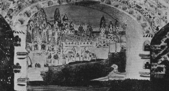 Город-Леденец. Эскиз декорации для оперы Н. А. Римского-Корсакова «Сказка о царе Салтане». 1900–1901 гг. Б., акв., кар. ГЦТМ.