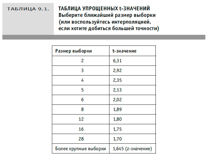 3. Найдем в таблице 9.1 (таблице упрощенных значений t-статистики) значение t, соответствующее размеру выборки: для выборки, состоящей из пяти объектов, t = 2,13. Обратите внимание, что для очень больших выборок t близко к z-значению (нормальное распределение) 1,645.