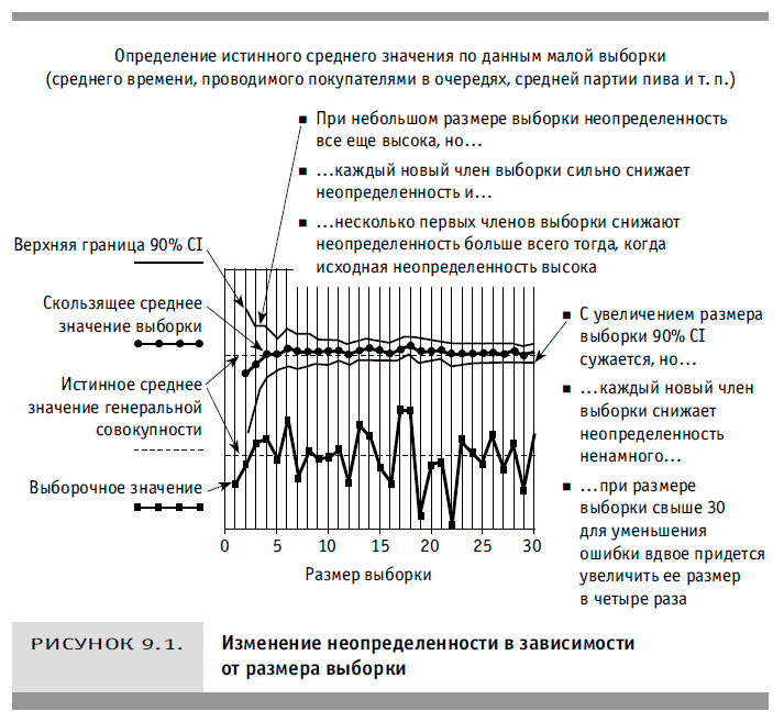 Короче говоря, термином «статистическая значимость» часто злоупотребляют те, кто не вполне понимает, что он означает. Неужели эти люди действительно думают, что снижение неопределенности происходит только при выборке, достигшей этого порогового значения? Или же они считают, что экономическая стоимость информации, полученной при изучении малой выборки, всегда меньше затрат на проведение измерений? По своему опыту могу сказать: когда в любой компании проводится случайная выборка, всегда найдется «эксперт», точно знающий, что можно, а чего нельзя делать в статистике. Но я обнаружил, что процент ошибок в туманных воспоминаниях таких экспертов о статистике, которую они учили когда-то давно, на первом курсе университета, бывает намного выше ошибки при малой выборке.