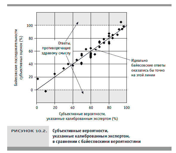 Обратите внимание: для того, чтобы согласовываться с другими субъективными ответами, одно из пары байесовских значений должно быть меньше нуля, а другое – больше 100 %. Очевидно, что эти значения противоречили бы здравому смыслу, но когда калиброванные эксперты давали свои субъективные оценки, они не знали, что возникнет такая проблема. Однако в большинстве случаев полученные ответы оказались даже более близкими к «собственно байесовским», чем ожидали калиброванные эксперты (см. рис. 10.2).