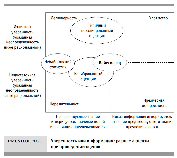 На рисунке 10.3 калиброванный эксперт (обладающий байесовским инстинктом и не страдающий как избытком, так и недостатком уверенности) сравнивается с тремя другими специалистами – использующим традиционные небайесовские методы выборки, такие как t-статистика, некалиброванным оценщиком и чистым байесовским оценщиком. Эта концептуальная схема показывает нам, как соотносятся с байесовским используемые ими подходы. Одна ось показывает, насколько специалисты уверены в своих оценках по сравнению с реальной вероятностью правильности их оценок, другая ось – насколько они учитывают предыдущую информацию.